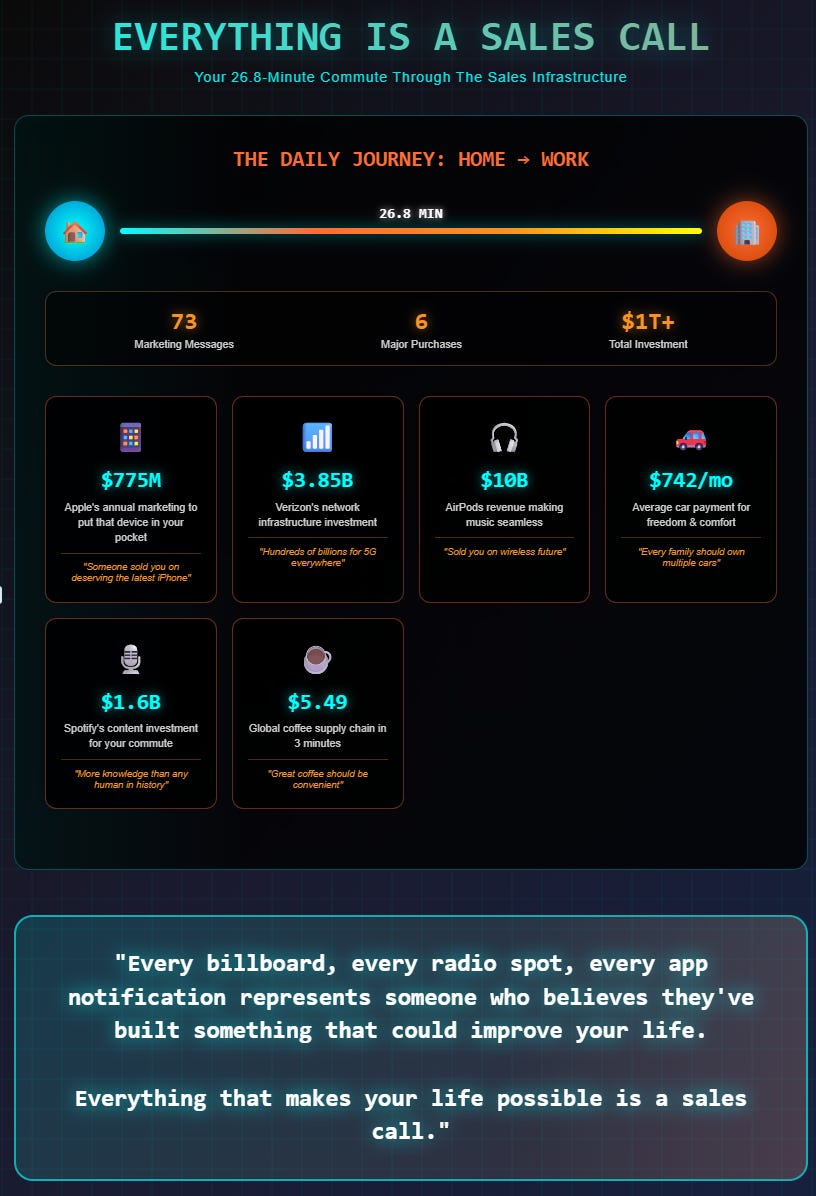 During that 26.8-minute commute, you encountered approximately 73 messages about products and services designed to solve problems you didn't even know you had. That's not manipulation—that's innovation discovery. Every billboard, every radio spot, every app notification represents someone who believes they've built something that could improve your life.